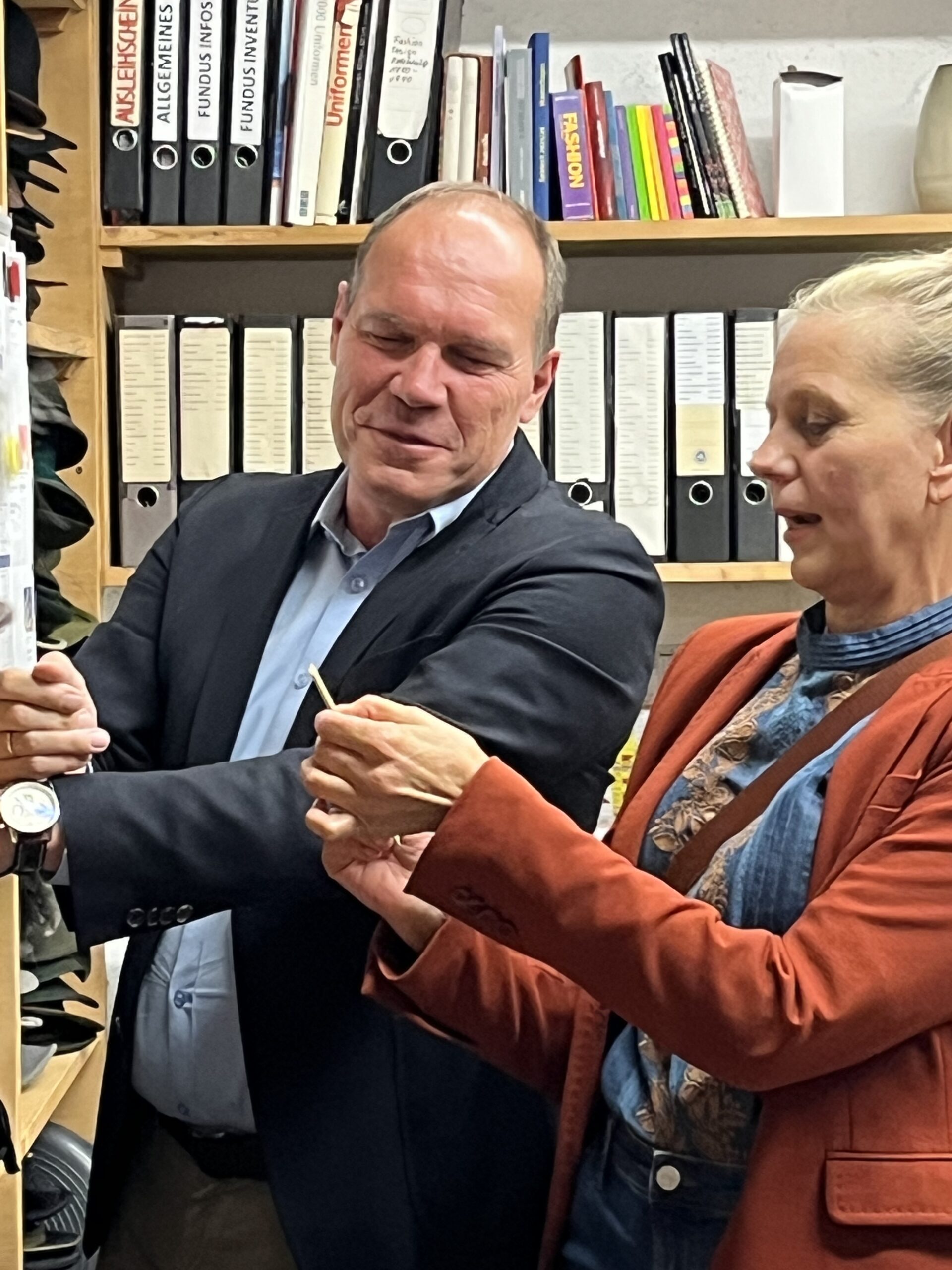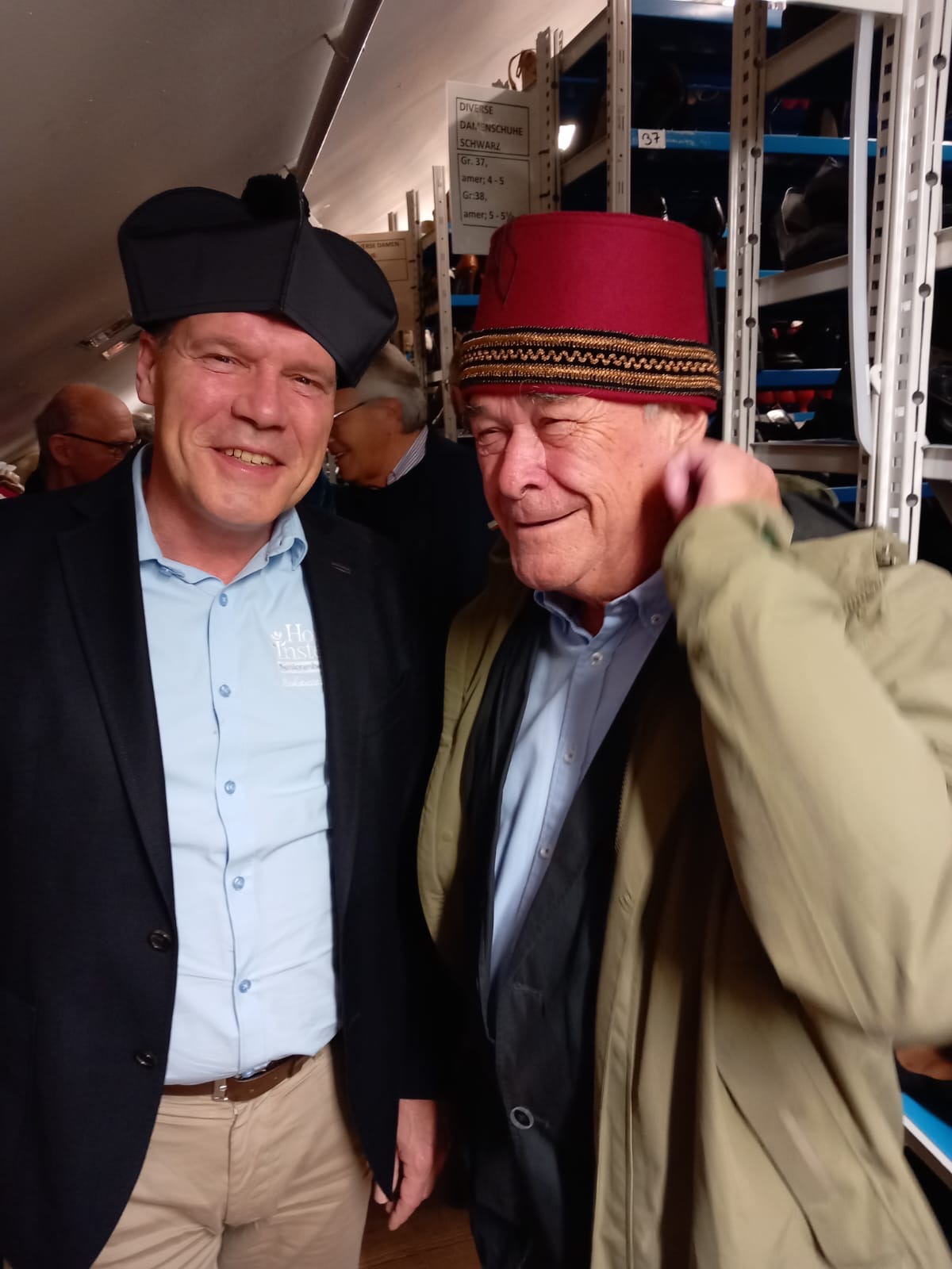 Einem Blick in die Schneiderei, in der derzeit die Kostüme für die Premieren der ersten Spielzeit in der Intendanz Søren Schuhmachers gefertigt werden, folgte ein Besuch in dem Kostümfundus, der seinem Namen alle Ehre macht: Im Kostümfundus ist – fast – alles zu finden. Regal an Regal, Kleiderstange an Kleiderstange, Schublade an Schublade reiht sich in bester Ordnung und Beschriftung die Sammlung des Fundus‘ aneinander und stapelt sich übereinander. Mäntel, Jacken, Hosen, Anzüge, Hemden, Hüte, Taschen und natürlich Schuhe aller Größen, und unendlich vieles mehr.
