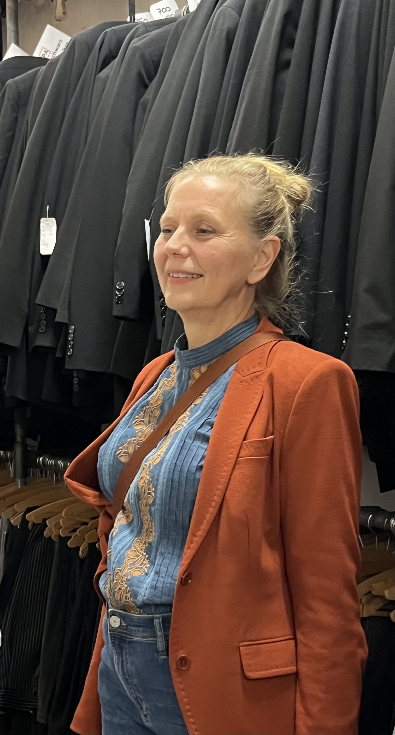 Die aus Düsseldorf stammende Ausstatterin hat zur Spielzeit 2024/2025 ihre neue Aufgabe als Leiterin der Kostümabteilung in Hagen angetreten und ihr Büro weit oben unterm Dach des Theaters bezogen. Dort fand auch die Führung, zu der Anja Müller die Gäste des Theatertreffs eingeladen hatte, ihren Höhepunkt – auch im wörtlichen Sinne. Denn es sind durchaus einige Treppen zu steigen, will man die große Kostüm-Abteilung des Theater Hagens erreichen.