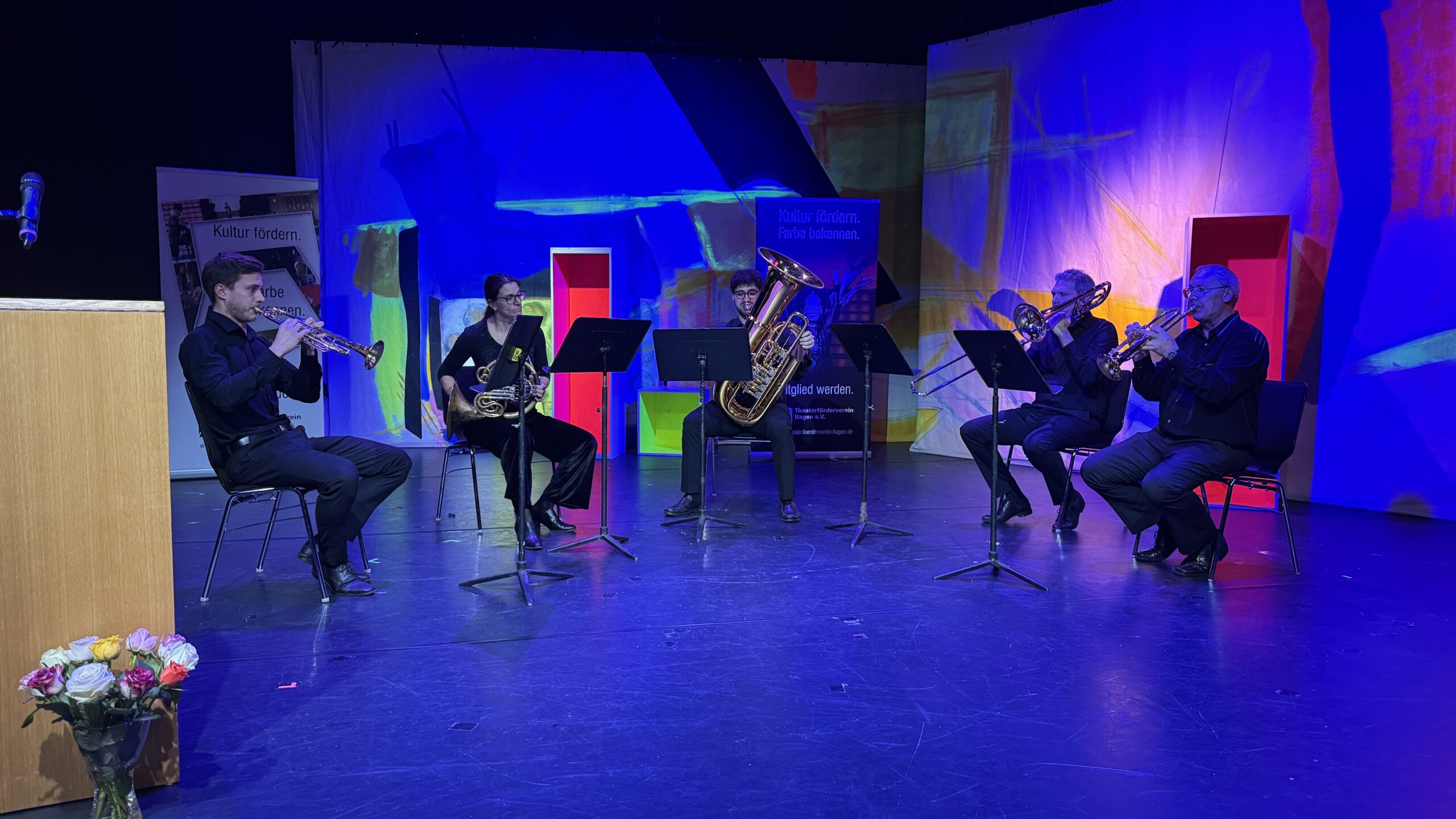Mit strahlenden Klängen eröffnete das Bläserquintett des Philharmonischen Orchesters den Empfang und durfte sich über den begeisterten Applaus des Publikums freuen. Aber nicht nur die Musik förderte die heitere Stimmung im bis auf den letzten Platz besetzten LUTZ: Jürgen Bild, Oberbürgermeister Denis Rehbein und Intendant Søren Schuhmacher waren sich darin einig, dass für das Hagener Theater trotz Budgetkürzungen eine gute Zeit begonnen habe, denn die Aufführungen im Theater und in der Stadthalle lockten immer mehr Zuschauer ins traditionsreiche Haus. Dennoch wünsche man sich, so der Vorstandsvorsitzende des Vereins, dass die Theaterfreunde selbst aktiv würden, um dem Theater neue Freunde zu gewinnen: „Wenn jeder von Ihnen eine weitere Person ins Theater bringen würde und diese wieder eine weitere Person, dann hätten wir bald wieder ein volles Haus.“