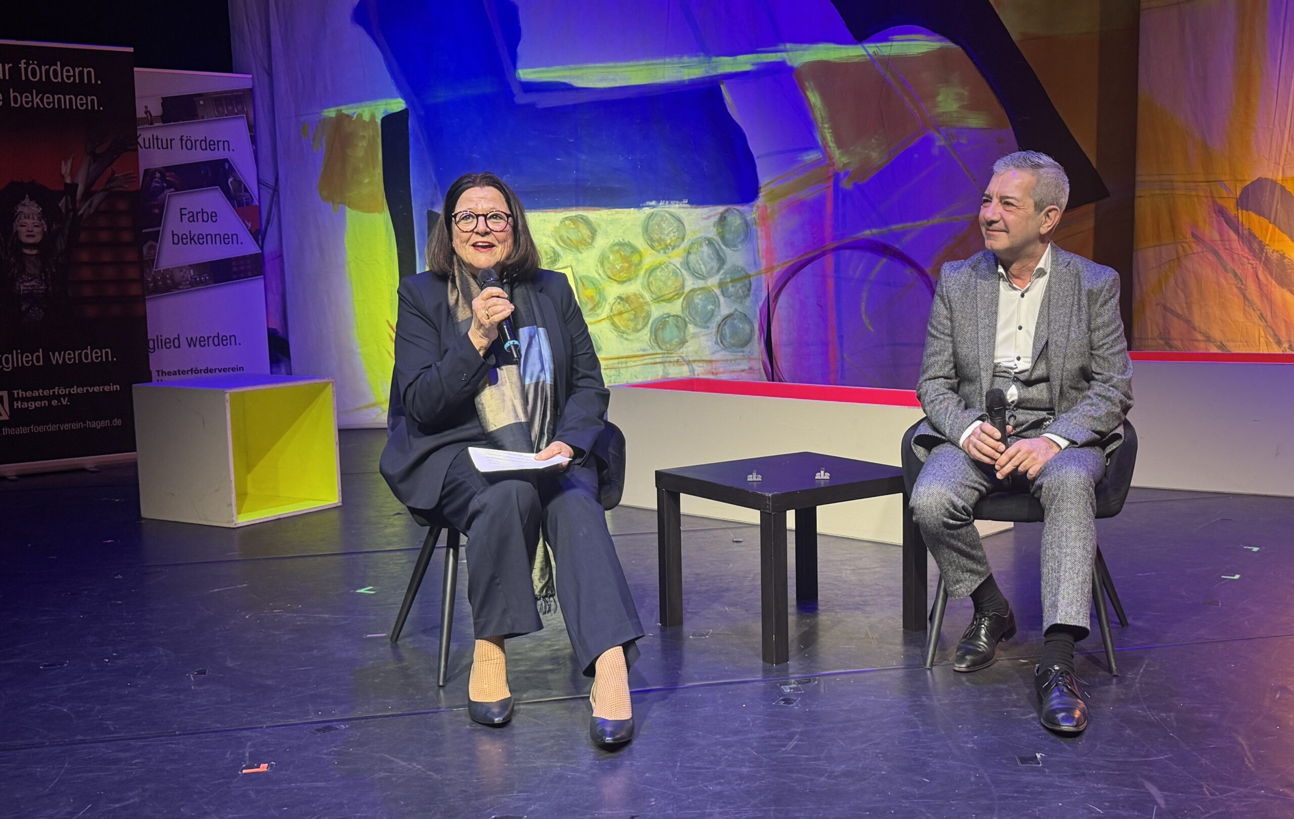 Dass das Theater in der Volme-Stadt kein Elfenbeinturm sein wolle, sondern im Austausch mit der Stadtgesellschaft stehe, betonte Intendant Søren Schuhmacher. Die Öffnung in die Gesellschaft hinein sehe er bereits in dem Willkommenskonzert „Welcome! Hosgeldiniz!“ zum Auftakt verwirklicht, in dem die anatolische Sängerin Begüm Tüzemen und die Hagenerin Vanessa Henning gemeinsam auftraten. Und mit Blick in die Zukunft erwähnte der Chef des Hauses einen vom Land NRW geförderten Kompositionsauftrag, der in der Spielzeit 2027/28 eine Jugendoper auf die Hagener Bühne bringen werde. Auch mit beschränkten Mitteln könne großes Theater gestaltet werden, aber ohne die Unterstützung der Fördervereine wäre dieses Programm nicht zu schaffen.